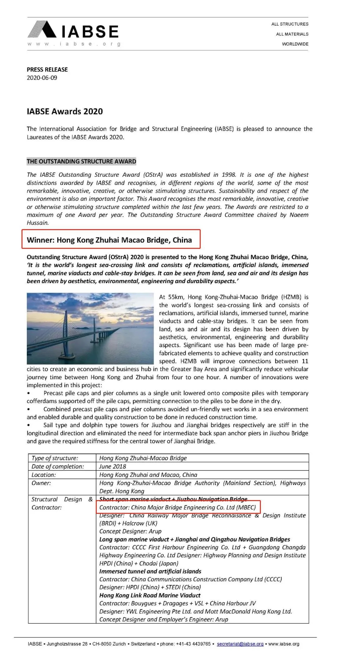 近日,國(guó)際橋梁與結(jié)構(gòu)工程協(xié)會(huì)(IABSE)公布了入圍及獲得2020年IABSE杰出結(jié)構(gòu)大獎(jiǎng)的橋梁,中國(guó)船舶武船集團(tuán)武船重工股份參建的港珠澳大橋榜上有名,榮獲2020年IABSE杰出結(jié)構(gòu)大獎(jiǎng)(OStrA)。“IABSE杰出結(jié)構(gòu)獎(jiǎng)”是國(guó)際橋梁工程界公認(rèn)的最高獎(jiǎng)項(xiàng),專門(mén)授予全世界最具創(chuàng)新性的橋梁和建筑結(jié)構(gòu)。