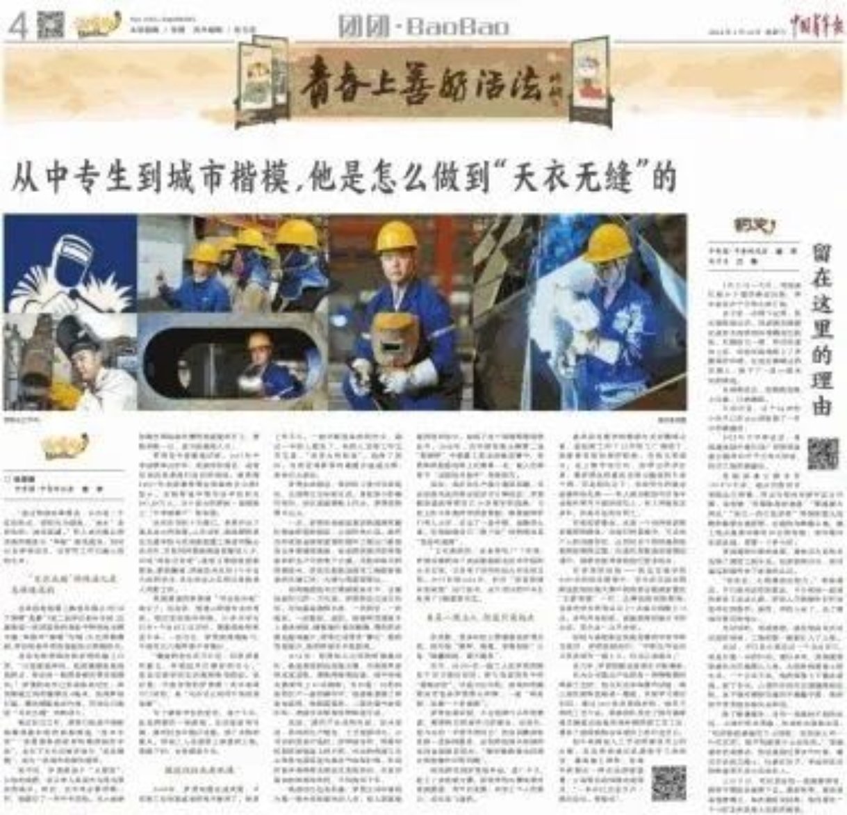 “透過焊接面罩看去,白光是一個(gè)紅色的點(diǎn),焊絲化為熔池,‘池水’是彩色的,波紋蕩漾。”外人或許難以將詩意的描述與“焊接”聯(lián)系起來,但對(duì)90后羅賢而言,這樣的工作已融入他的生命。