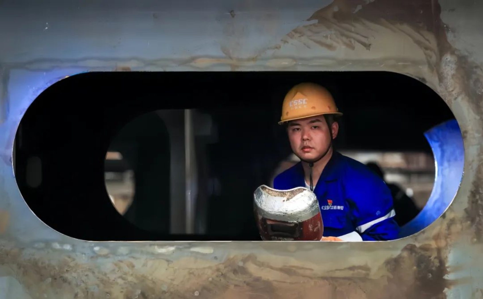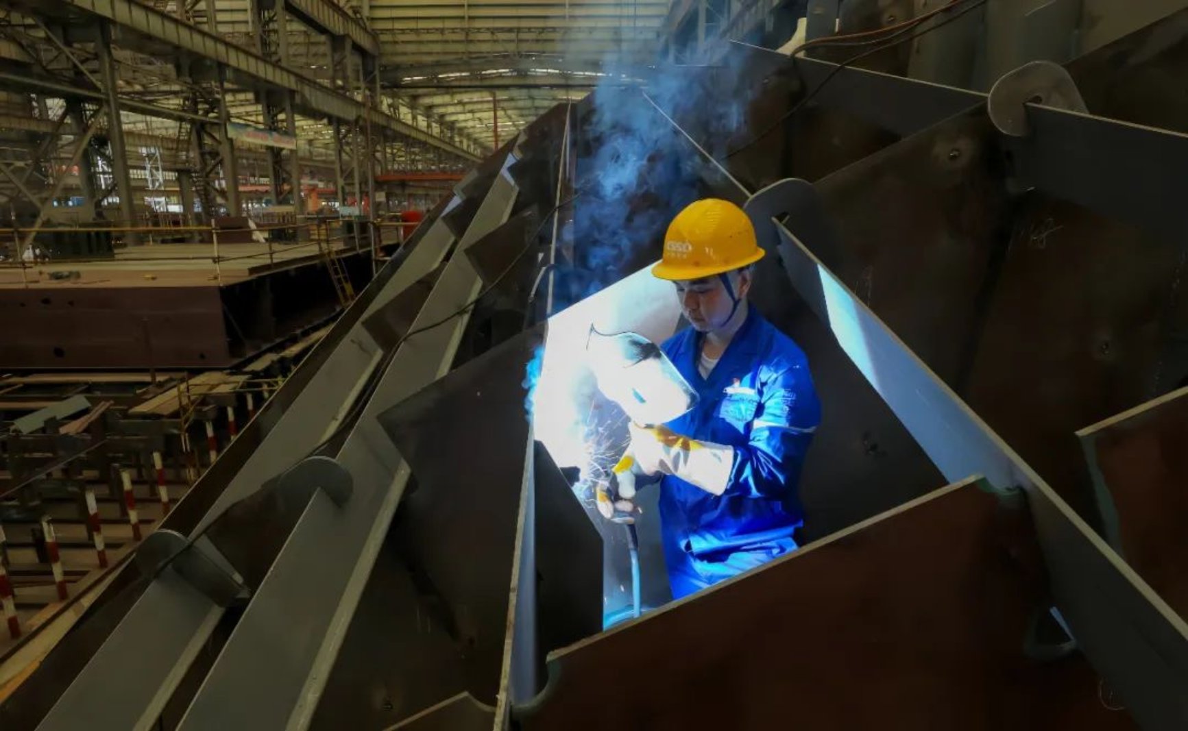 在船臺(tái)車間,總能看到一抹深藍(lán)色的身影手持焊槍半蹲半跪,焊接聲“嗞嗞”作響,白色焊煙騰起,焊絲和板件的連接處發(fā)出刺眼的光。