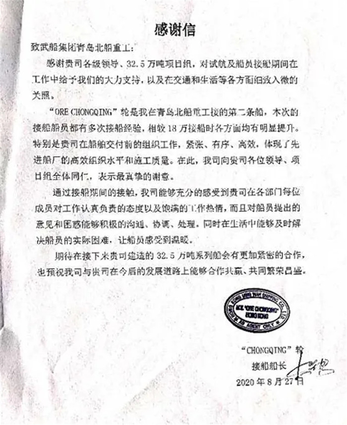 ▲“ORE CHONGQING”輪接船船長(zhǎng)發(fā)來(lái)感謝信