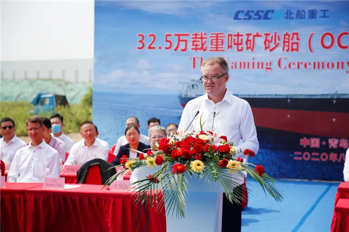 儀式現(xiàn)場(chǎng)由北船重工副總經(jīng)理鮑會(huì)勇主持命名暨交船儀式,北船重工總經(jīng)理谷克超、上海船舶研究設(shè)計(jì)院黨委書(shū)記王麟、中國(guó)船級(jí)社青島分社總經(jīng)理朱永實(shí)、勞氏船級(jí)社全球首席運(yùn)營(yíng)官M(fèi)ark Darley、香港明華船務(wù)有限公司副總經(jīng)理李霖、工銀租賃航運(yùn)金融事業(yè)部執(zhí)行總經(jīng)理郭芳萌先后致辭,工銀租賃項(xiàng)目與投資審批部副總經(jīng)理高潔將本船命名為“ORE CHONGQING”并為其砍纜。