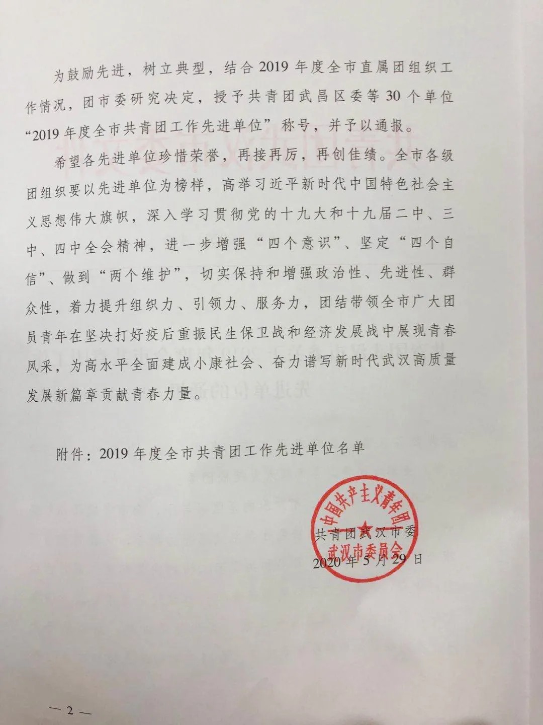 武船集團(tuán)團(tuán)委被授予2019年度武漢市共青團(tuán)工作先進(jìn)單位榮譽(yù)稱號。