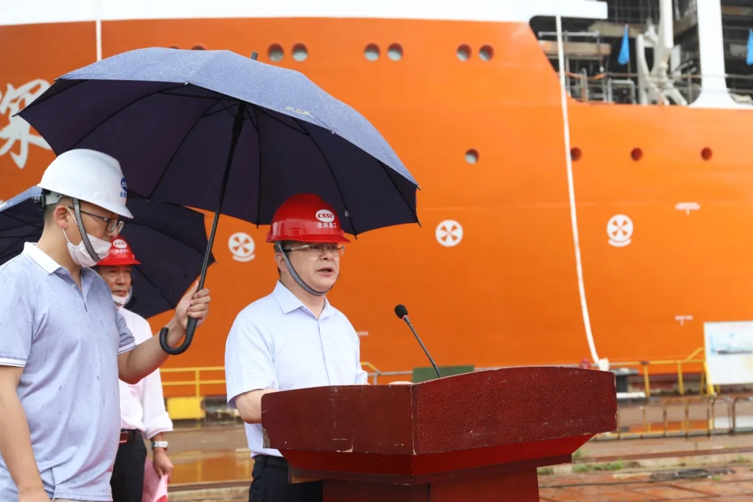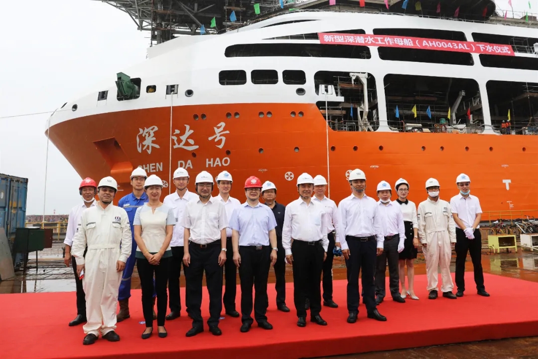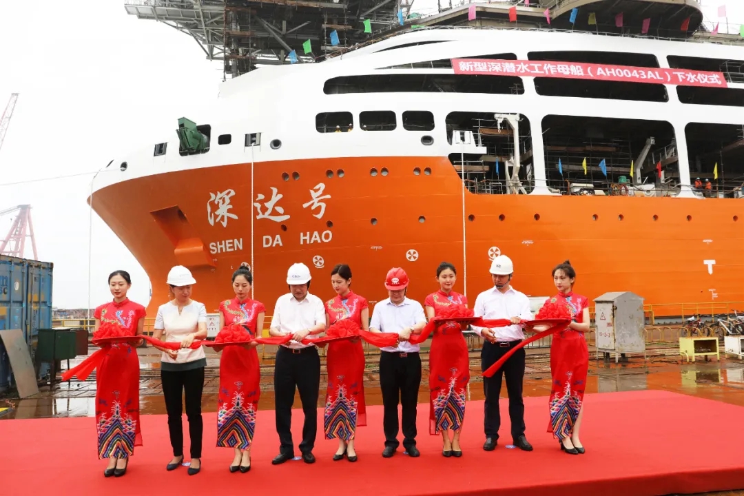 新型深潛水工作母船出塢儀式由武船集團北船重工副總經理馮寧主持,交通運輸部上海打撈局副局長、總工程師蔣巖與武船集團黨委委員、北船重工黨委書記、董事長王國海先后致辭,并同CCS船級社青島分社副總經理鞠立強、DNVGL船級社大連青島分區(qū)經理晏曉琳等共同為船舶出塢剪彩。