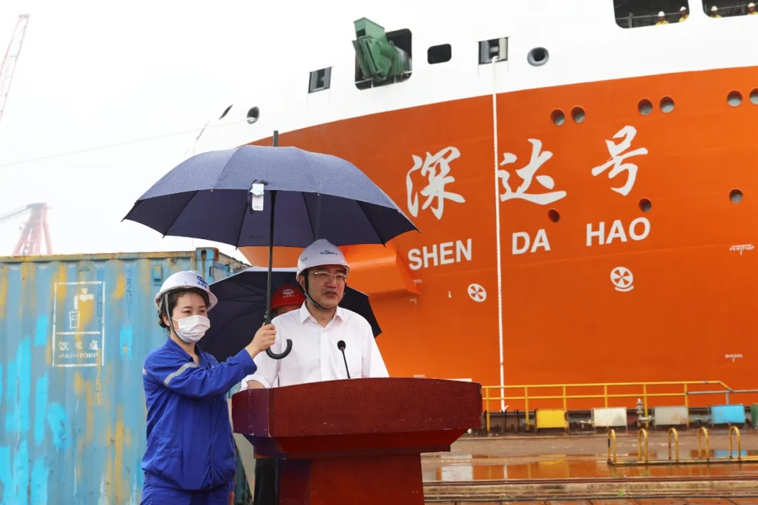 交通運輸部上海打撈局深海工程技術研發(fā)中心主任黃衍、新型深潛水工作母船船東監(jiān)造組首席代表王金龍、武船集團相關領導等參加儀式。