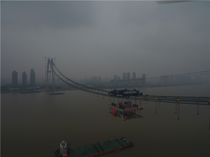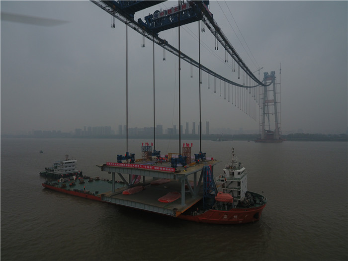 11月15日,由武船集團制造的國內(nèi)首座跨長江雙層公路懸索橋――武漢楊泗港長江大橋首個鋼桁梁節(jié)段吊裝成功。