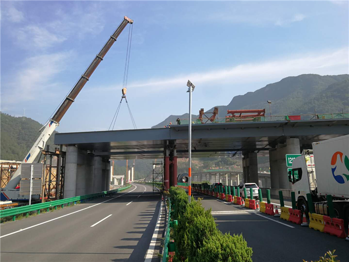 濟(jì)祁高速三覺互通連接線新橋大橋項(xiàng)目為單拱斜跨斜拉橋,分為鋼箱拱、鋼梁橋面結(jié)構(gòu)和人行梯道橋三部分,工程總噸位約為5400噸,其中大橋主拱跨徑170米,主拱高度72.6米,主拱結(jié)構(gòu)總重約2000噸,主拱軸線與橋梁縱向水平面夾角為25度,新橋大橋主拱的順利合攏為后續(xù)大橋鋼梁橋面結(jié)構(gòu)的施工奠定了堅(jiān)實(shí)的基礎(chǔ)。