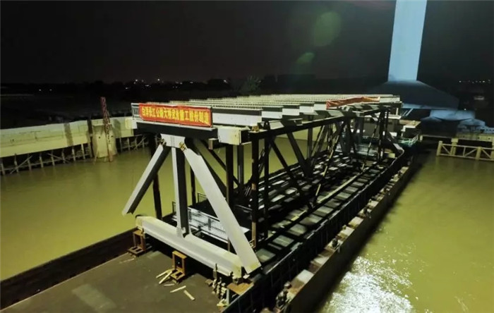 ▲白洋長(zhǎng)江大橋主橋首個(gè)鋼桁梁節(jié)段裝船發(fā)運(yùn)