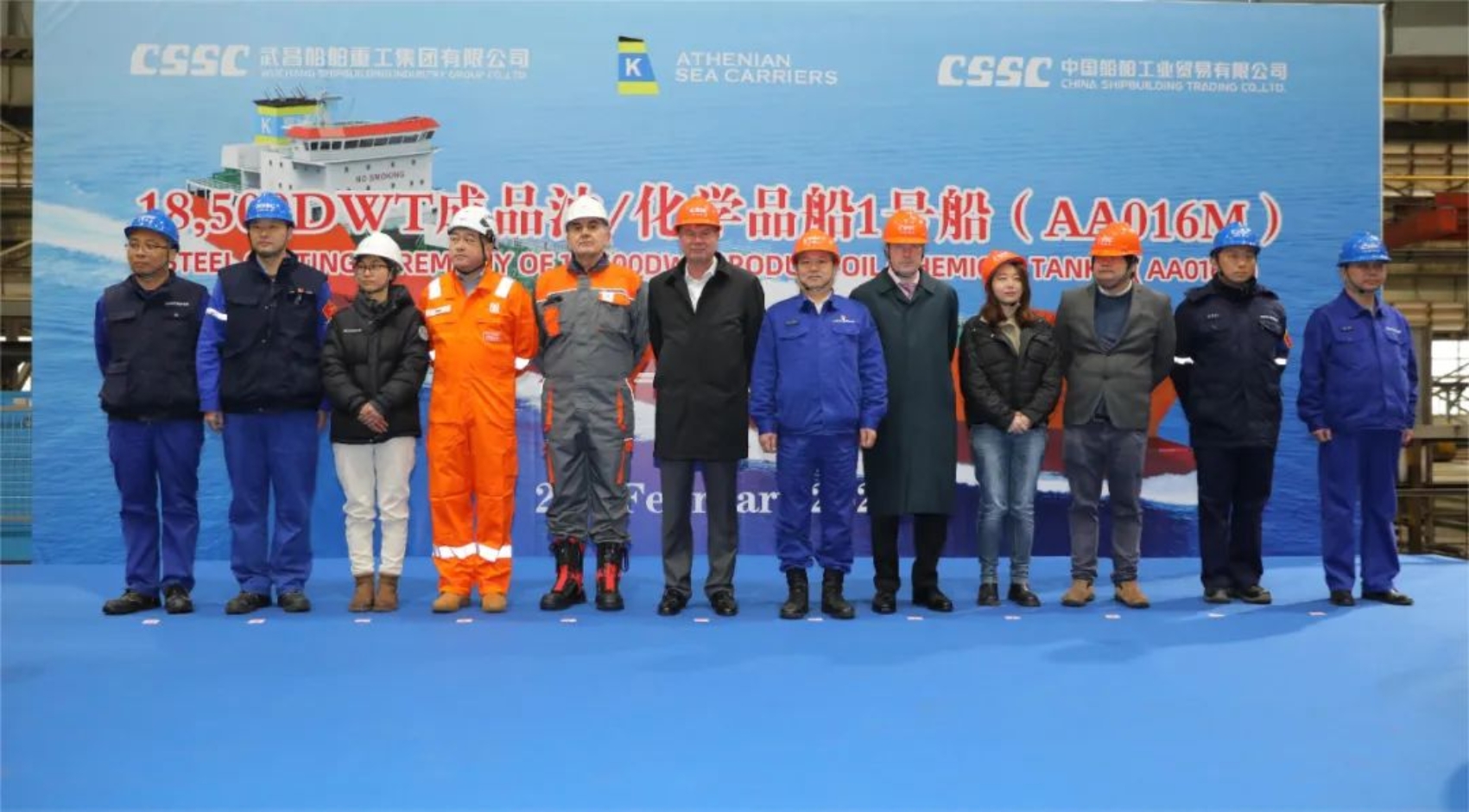 2月20日下午,由中國船舶集團武昌造船為希臘Athenian Sea Carriers公司建造的 18500DWT油化船1號船順利開工。Athenian Sea Carriers、SeaQuest Marine、Braema、LR船級社、中船貿(mào)易及武昌造船等相關(guān)單位領(lǐng)導(dǎo)、來賓出席開工儀式。
