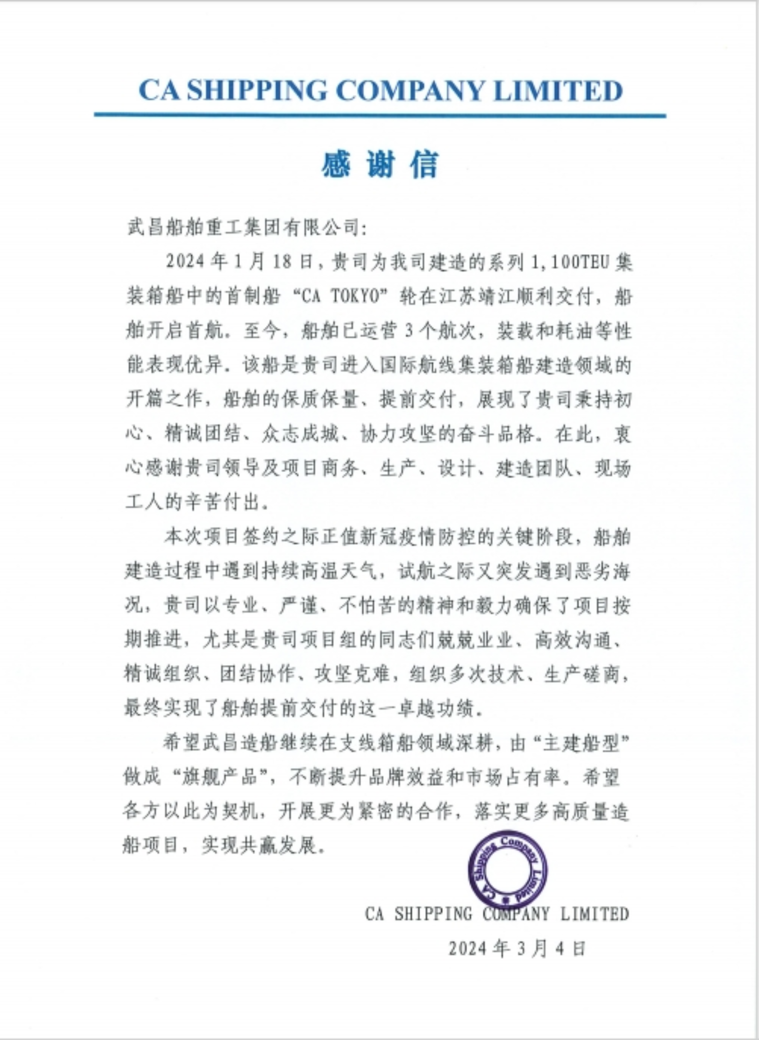 “1月18日,貴司為我司建造的系列1100TEU集裝箱船中的首制船“CA TOKYO”輪在江蘇靖江順利交付,船舶開啟首航。至今,船舶已運營3個航次,裝載和耗油等性能表現(xiàn)優(yōu)異。”——CA SHIPPING COMPANY LIMITED