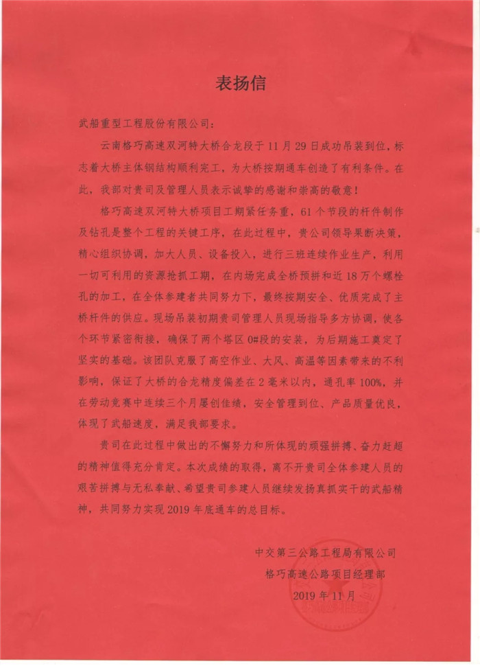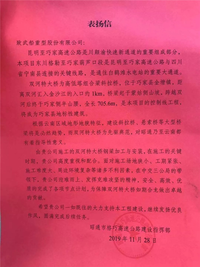 ▲武船重工股份獲昭通市格巧高速公路建設(shè)指揮部書面表揚