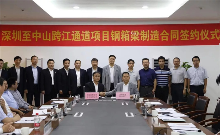 10月29日下午,廣東省深圳至中山跨江通道項(xiàng)目鋼箱梁制造G03標(biāo)段簽約儀式在中山舉行,武船重型工程股份有限公司(簡稱武船重工股份)總經(jīng)理吳躍波代表公司與廣東省公路建設(shè)有限公司黨委書記、董事長王康臣在合同文本上簽字,武船集團(tuán)黨委書記、董事長陳?劍?黨委委員、副總經(jīng)理田軍,武船重工股份總工程師阮家順,常務(wù)副總經(jīng)理李立明出席簽約儀式。