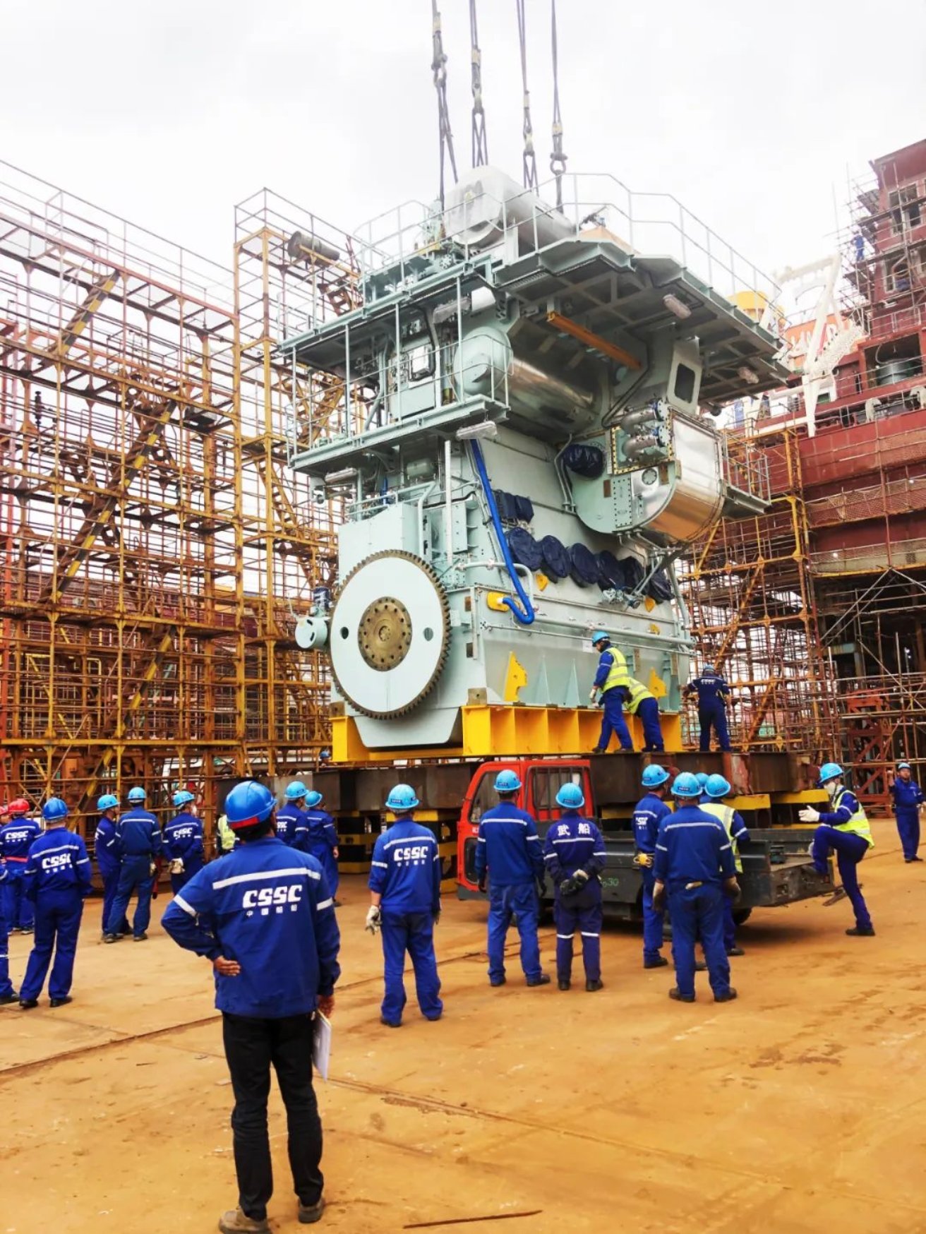 5月23日,由中國(guó)船舶集團(tuán)武昌造船承建的1100TEU集裝箱船1號(hào)船主機(jī)(整機(jī)發(fā)運(yùn)235噸),在雙柳廠區(qū)二號(hào)碼頭順利拖船至斜船架,起坡、轉(zhuǎn)運(yùn)至300噸吊車覆蓋區(qū)域,經(jīng)過(guò)各部門領(lǐng)導(dǎo)和員工的戮力同心,1100TEU集裝箱船1號(hào)船主機(jī)于當(dāng)天下午17:38分安全轉(zhuǎn)運(yùn)至48米跨主機(jī)放置區(qū)域。1100TEU集裝箱船1號(hào)船主機(jī)船運(yùn)至武昌造船碼頭,是武昌造船民船歷史上首次實(shí)現(xiàn)主機(jī)整船起坡、轉(zhuǎn)運(yùn)、吊裝。此次順利完成起坡、轉(zhuǎn)運(yùn)和吊裝工作,為后續(xù)主機(jī)進(jìn)艙安裝工作奠定堅(jiān)實(shí)基礎(chǔ)。