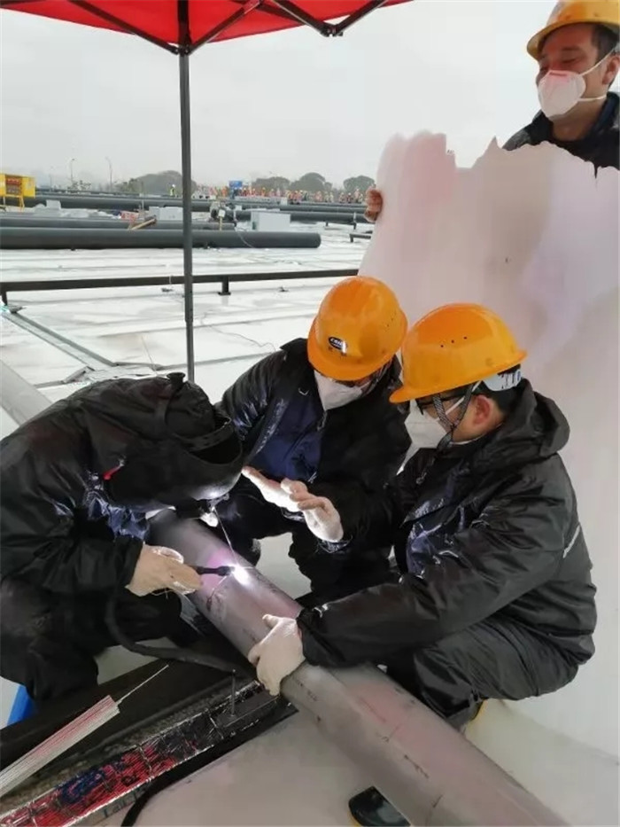 △雷神山醫(yī)院頂樓天臺(tái)現(xiàn)場(chǎng)冒雨施焊接作業(yè)